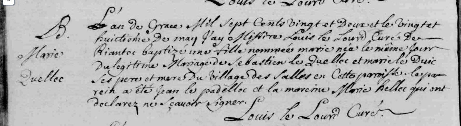| Baptême QUELLEC (LE) Marie - 1722 - Riantec |