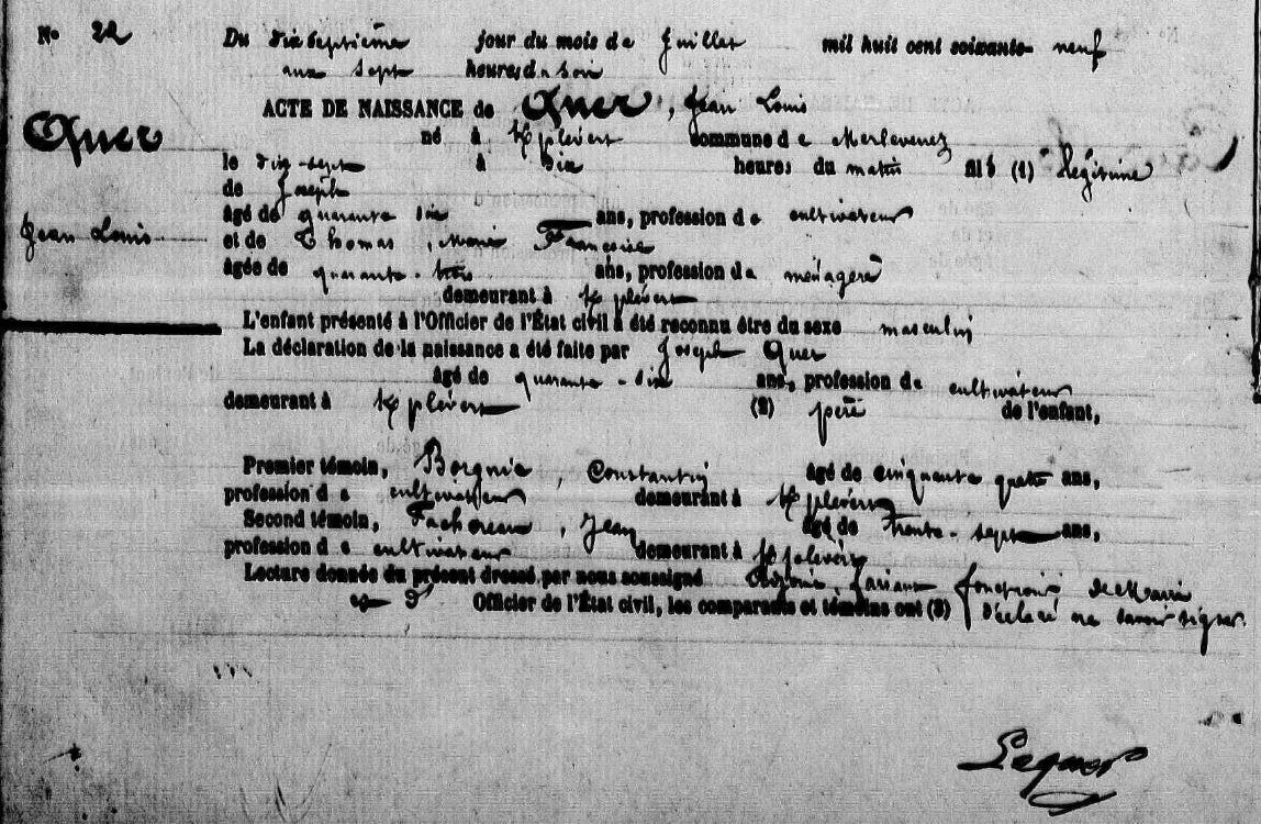 | Naissance QUER Jean Louis - 1869 - Merlevenez |