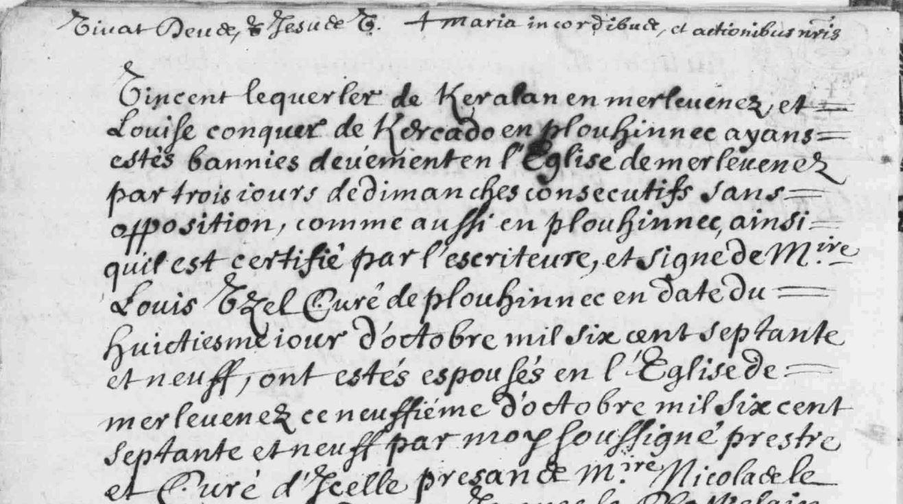 | Mariage QUERLER (LE) Vincent CONQUER Louise - 1679 - Merlevenez - 1 |