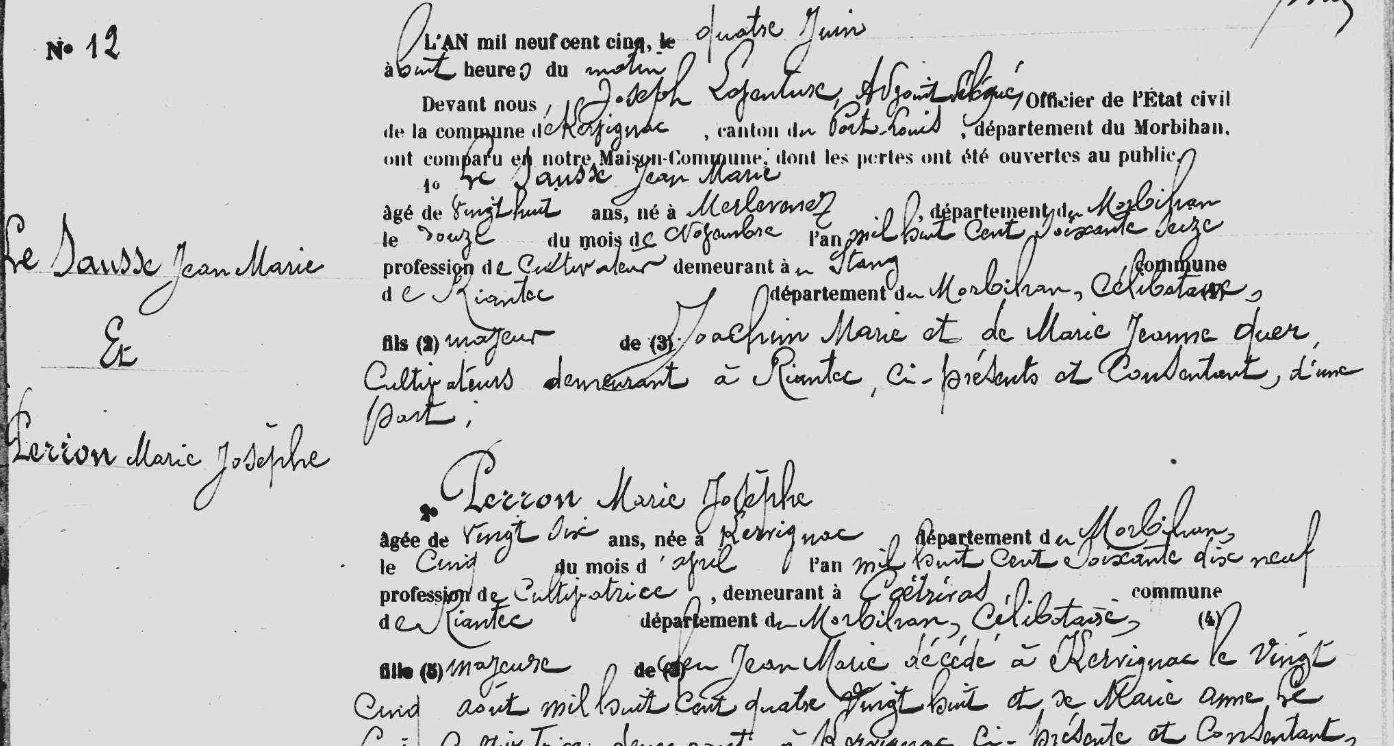 | Mariage : Date : 04/06/1905 Lieu : Kervignac (56) PERRON Marie Josephe, Elle naît 05/04/1879 à Kervignac (56), Coëtrivas 3. |