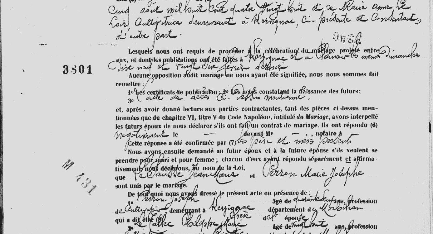 Mariage SAUSSE (LE) Jean Marie PERRON Marie Josephe - 1905 - Kervignac - 3 |