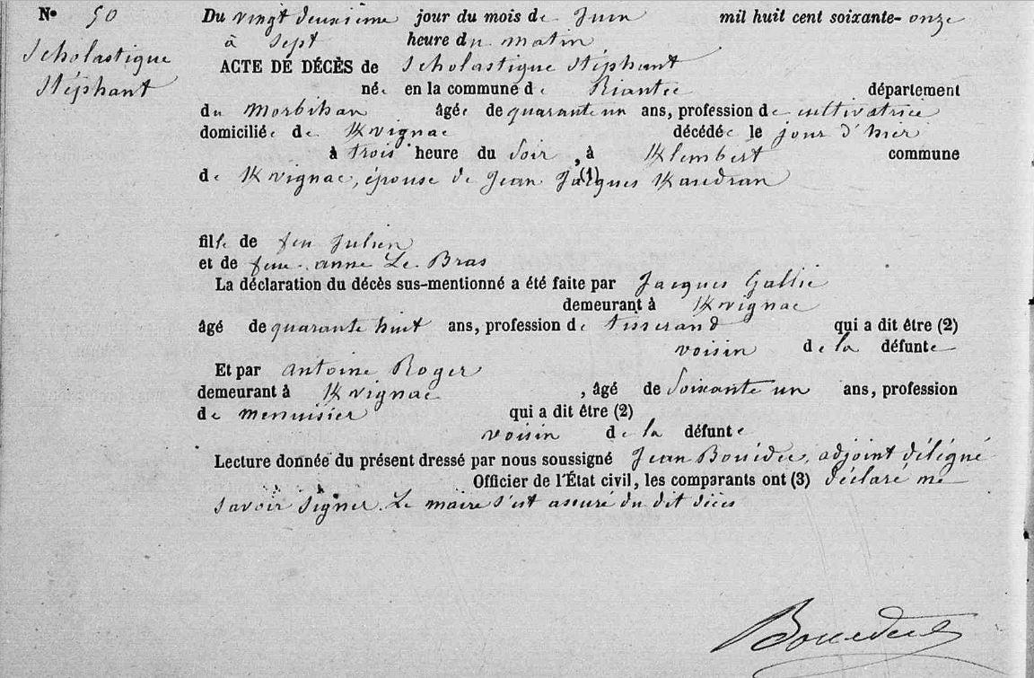 | Décès STEPHANT Scholastique (Pélagie) - 1871 - Kervignac |