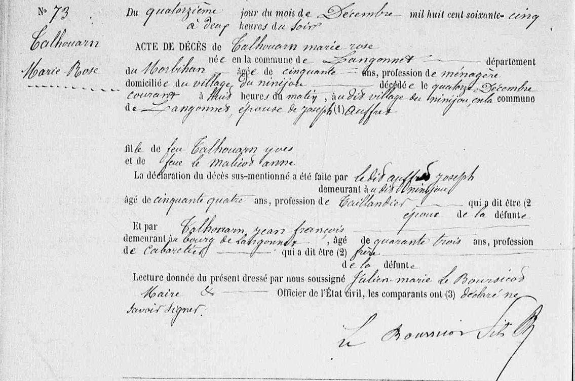 | 1. TALHOUARN Marie Rose Naissance : Date : ../../1815 Lieu : Langonnet (56) Unie avec AUFFRET Michel. Décès : Date : 14/12/1865 Lieu : Langonnet (56), Ninijou à l'âge de 50 ans. |