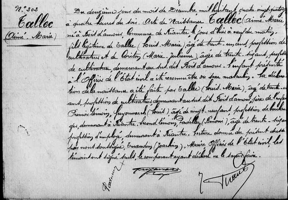 | Naissance TALLEC (LE) Aimé Marie - 1894 - Riantec |