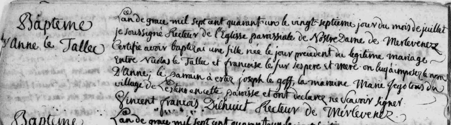 | Baptême TALLEC (LE) Anne - 1741 - Merlevenez |