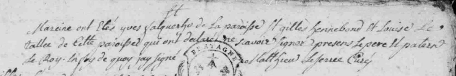 | Elle est née 26/07/1741 à Merlevenez (56), Lesténo. 27/07/1741, a lieu son baptême à Merlevenez (56), Eglise paroissiale de Notre Dame en Merlevenez à l'âge de 1 jour. Père : TALLEC (LE) Nicolas, Sosa 976, Laboureur Naissance : 1 Date : 24/04/1705 Lieu : Kervignac (56), Locohyerne Décès : Date : 13/02/1766 Lieu : Kervignac (56) à l'âge de 60 ans. Mère : FUR (LE) Françoise Marie, Sosa 977, Laboureuse Naissance : Date : 23/09/1713 Lieu : Kervignac (56), Keronan Décès : Date : 13/07/1773 Lieu : Kervignac (56) à l'âge de 59 ans. A sa naissance, ses père et mère étaient âgés de 36 ans et 27 ans. |