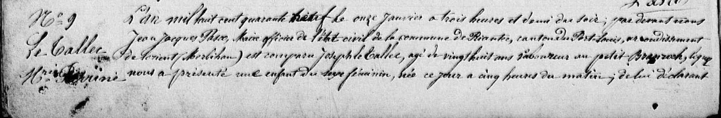 | Il naît à Kervignac (56), Locoyarn 29/11/1748. Père : TALLEC (LE) Jacques, Sosa 526, Laboureur Naissance : Date : 24/01/1705 Lieu : Kervignac (56), Locoyarn Décès : Date : 13/02/1775 Lieu : Kervignac (56), Locoyarn à l'âge de 70 ans. Mère : FRAPER (LE) Gillette, Sosa 527, Laboureuse Naissance : Date : 03/04/1710 Lieu : Kervignac (56) Décès : Date : 11/11/1779 Lieu : Kervignac (56), Locoyarn à l'âge de 69 ans. A sa naissance, ses père et mère étaient âgés de 43 ans et 38 ans. |