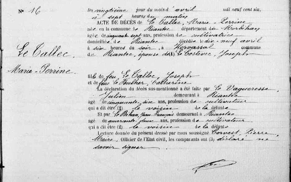 | 1. COSTEVEC (LE) Joseph Marie, Sosa 12 Naissance : Date : 19/08/1872 Lieu : Riantec (56), Kervassal Union : Date : 19/01/1902 Lieu : Riantec (56) avec VAGUERESSE (LE) Philomène, Sosa 13. |
