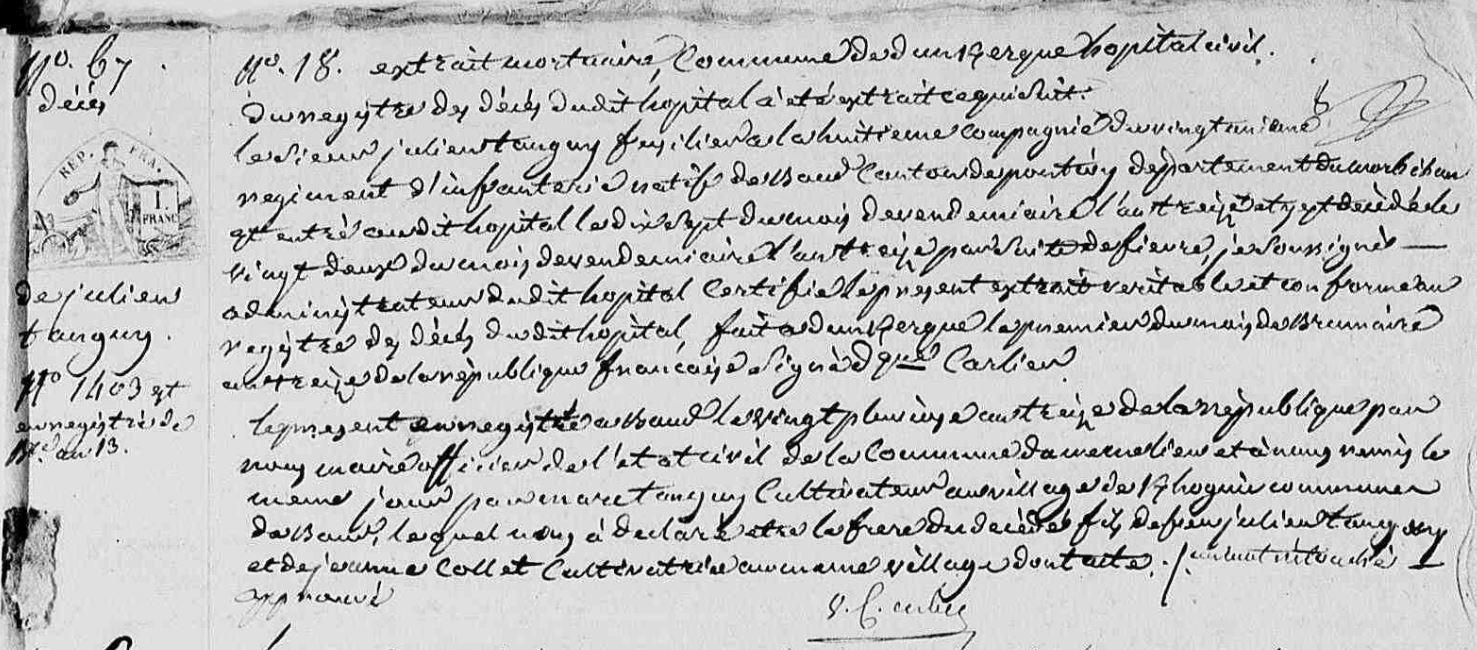 | 1. TANGUY Julien Naissance : Date : ../../1760 Décès : 1 Date : 14/10/1804 Lieu : Dunkerque (59), Hôpital à environ 44 ans. |