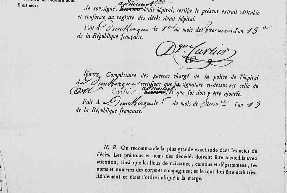 | 1 Note, Décès : Il est rentré le 9 octobre 1804 à l'hôpital civil de Dunkerque et y est décédé le 14. |
