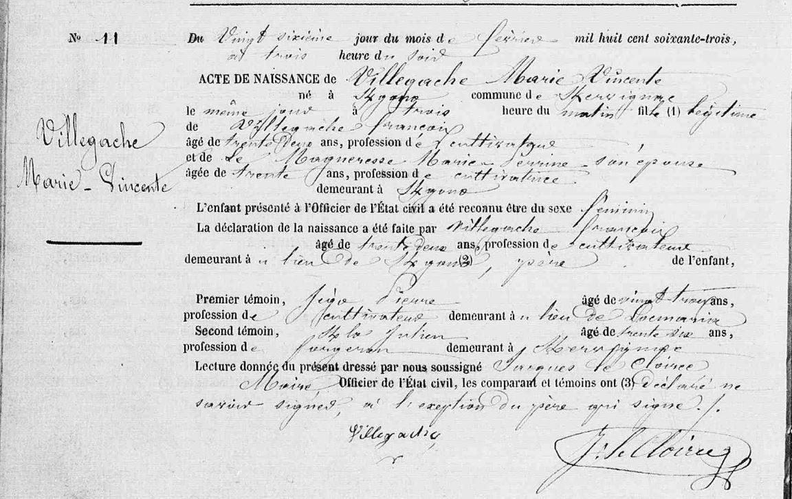 | Elle est née à Kervignac (56), Kergono 26/02/1863. Signature : Y. Père : VILLEGACHE François, Cultivateur Naissance : Date : ../../1830 Lieu : Noyal-Pontivy (56) Décès : Date : 12/08/1874 Lieu : Kervignac (56), Kergono à l'âge de 44 ans. Mère : MAGUERES (LE) Marie Perrine, Cultivatrice Naissance : Date : ../../1848 Décès : Date : ../../1881 à plus de 33 ans. A sa naissance, ses père et mère étaient âgés de 33 ans et plus de 15 ans. |