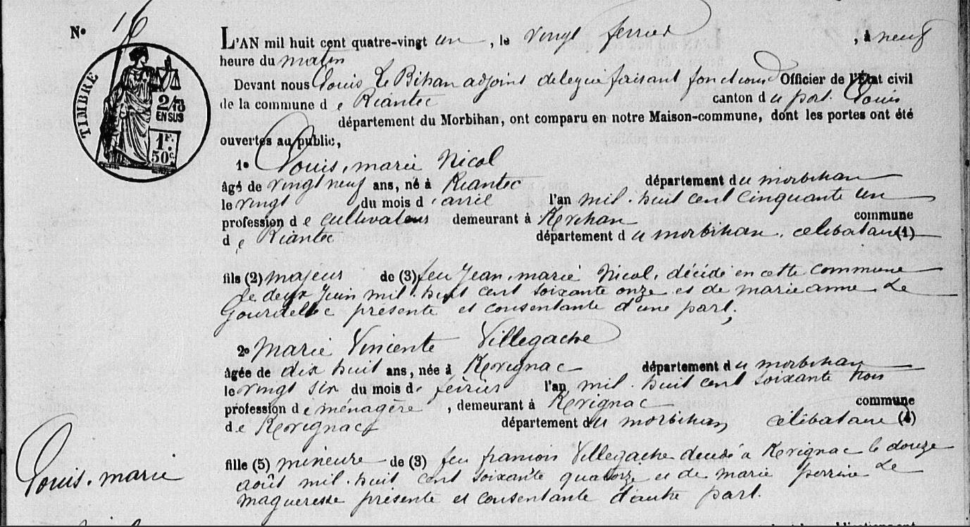 Mariage NICOL Louis Marie VILLEGACHE Marie Vincente - 1881 - Riantec - 1 |