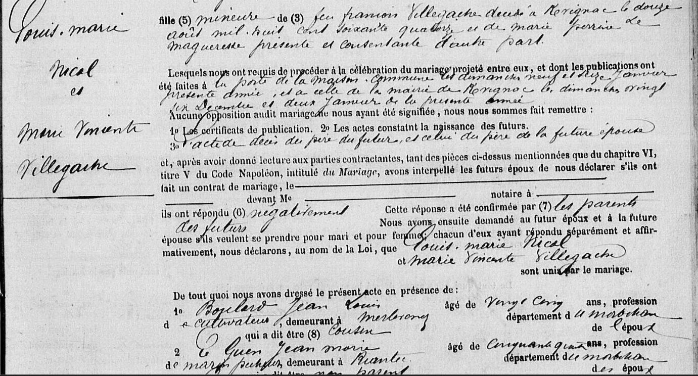 Mariage NICOL Louis Marie VILLEGACHE Marie Vincente - 1881 - Riantec - 3 |